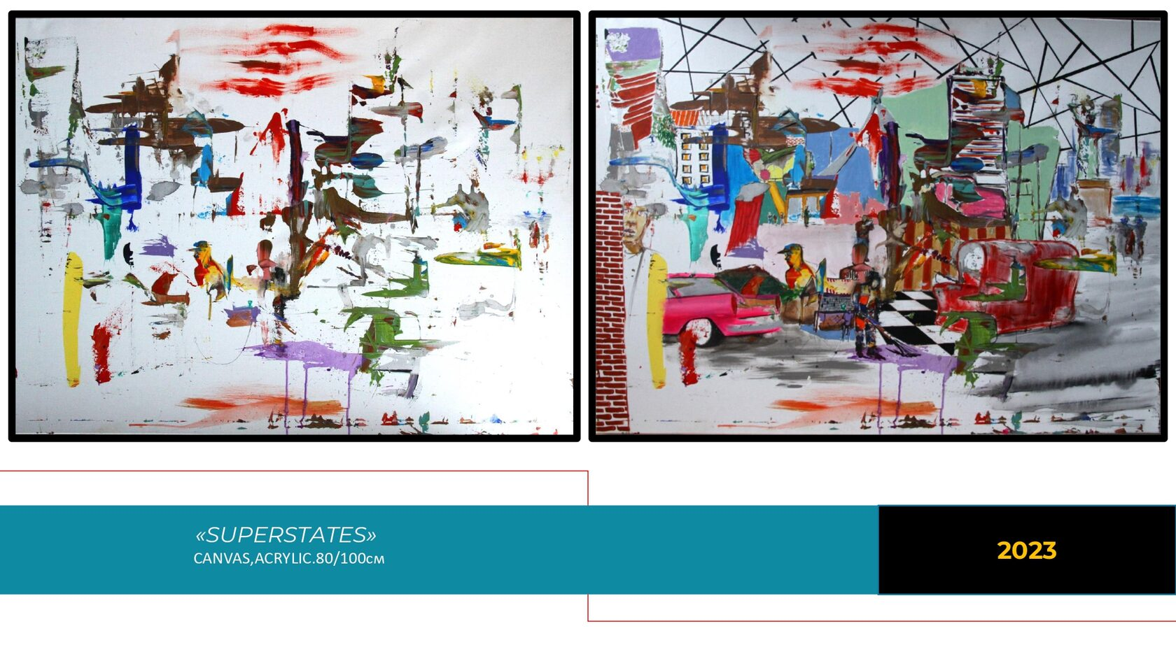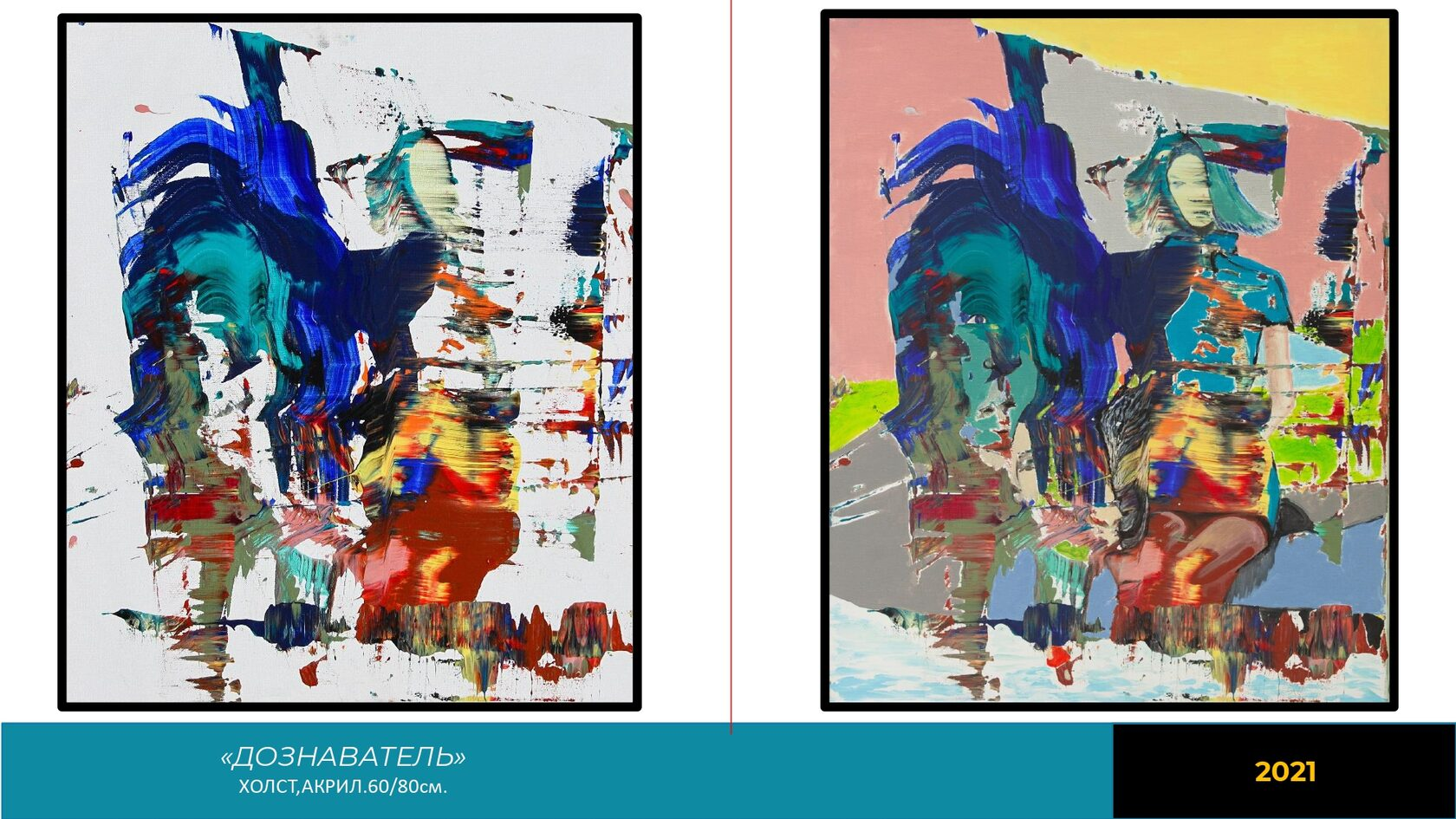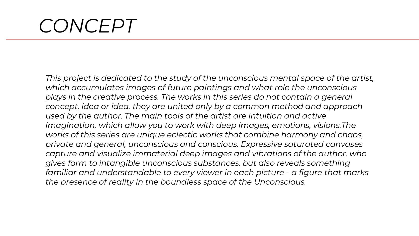 The paintings in this series are the unique eclectic works that unite the harmony and the chaos, the private and the general, the unconscious and the conscious. The expressive saturated canvases capture and visualize non-material deep images and vibrations of the author, who shapes the intangible unconscious substances. Also, in each painting, the artist reveals something familiar and comprehensible for any spectator — a figure that marks the reality presence in the boundless space of the Unconscious.